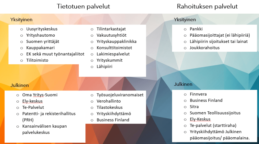 Tein kanditutkielman aiheesta ”Yritystukiverkoston merkitys kannattavan kasvun näkökulmasta” ja jaoin uuden yrittäjän tukiverkoston nelikenttään: tieto- ja rahoitustuki, joiden sisällä julkinen ja yksityinen. Käytän samaa jaottelua mutta päivitettynä versiona: